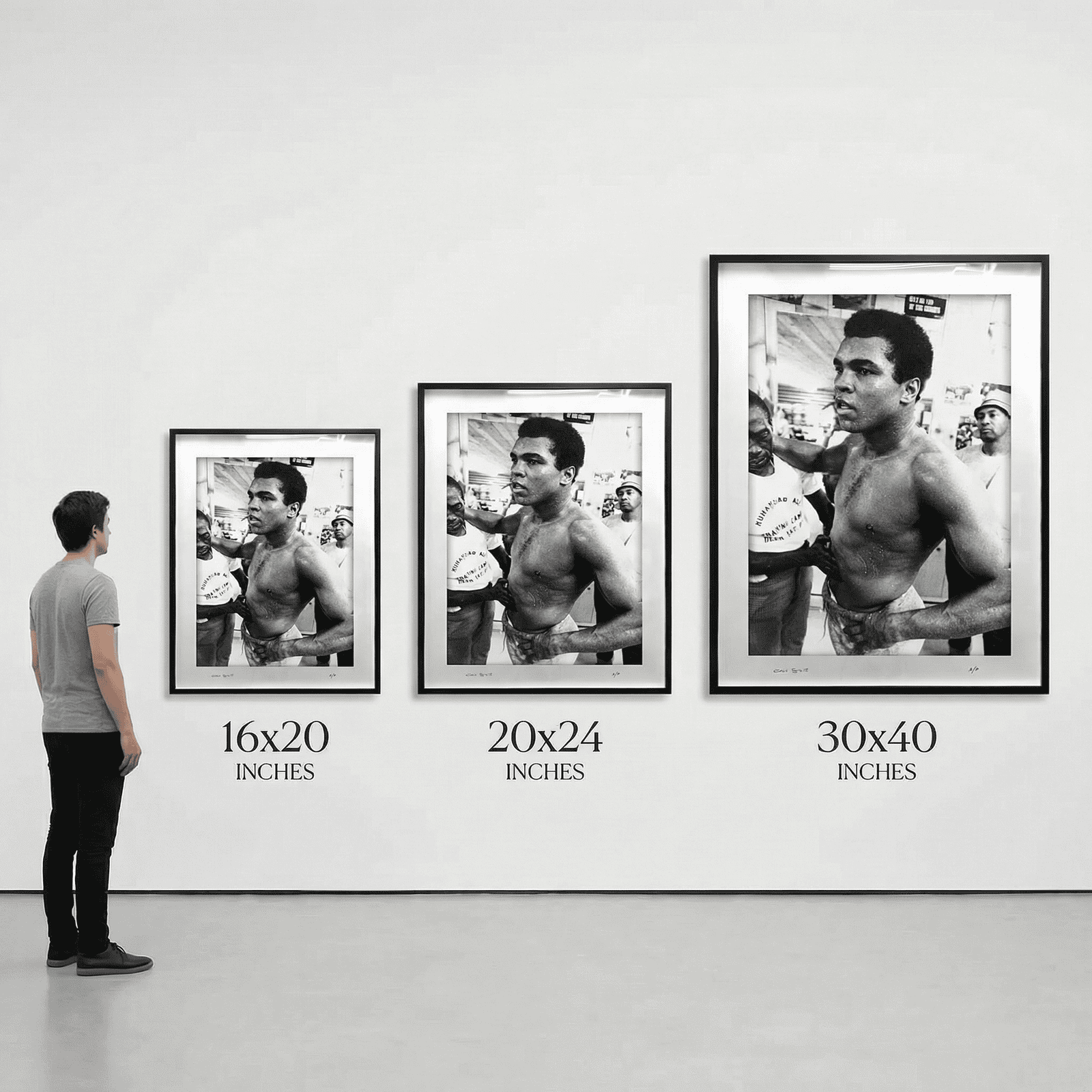 This striking black-and-white Muhammad Ali print is offered in two distinguished editions, crafted with museum-quality precision.